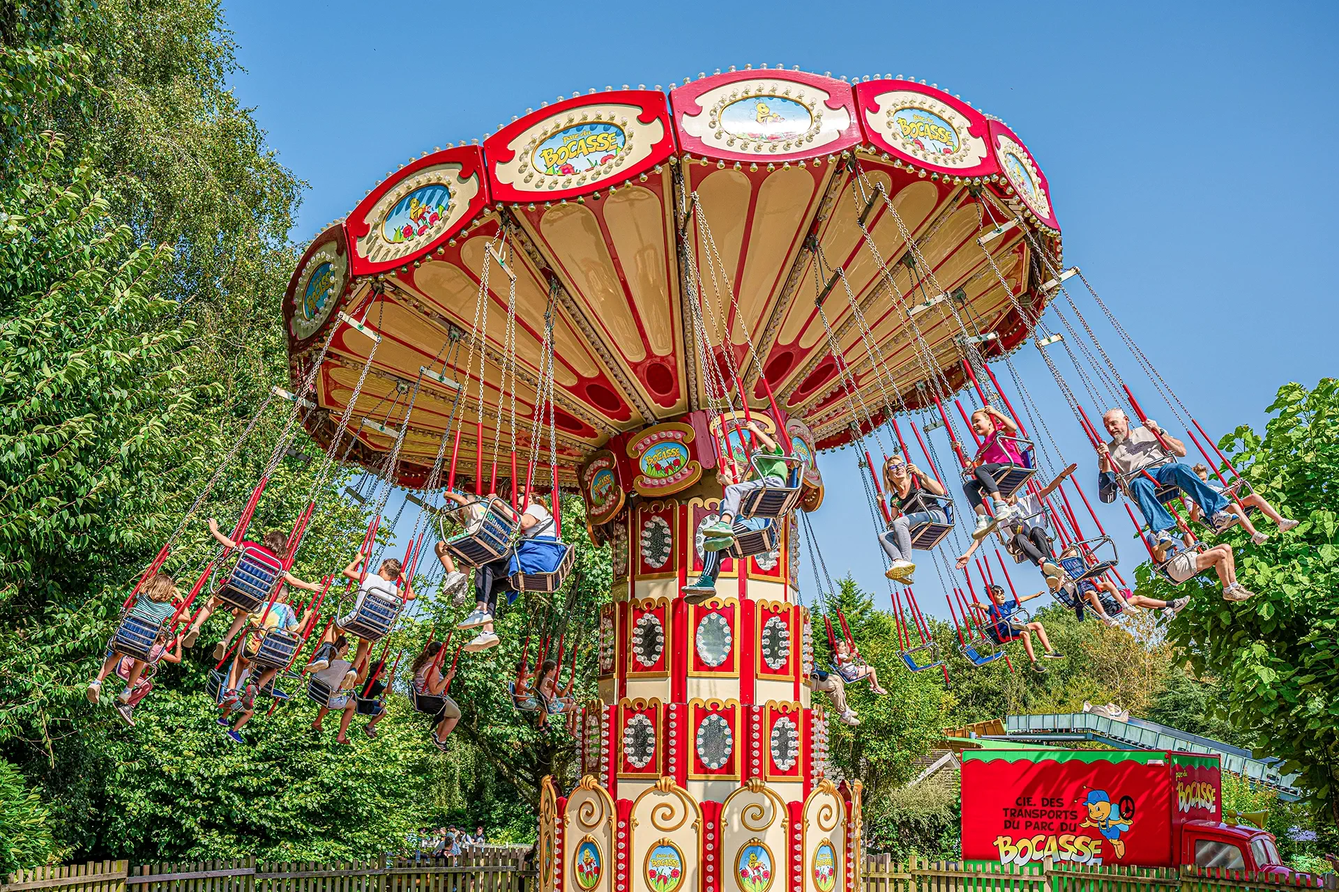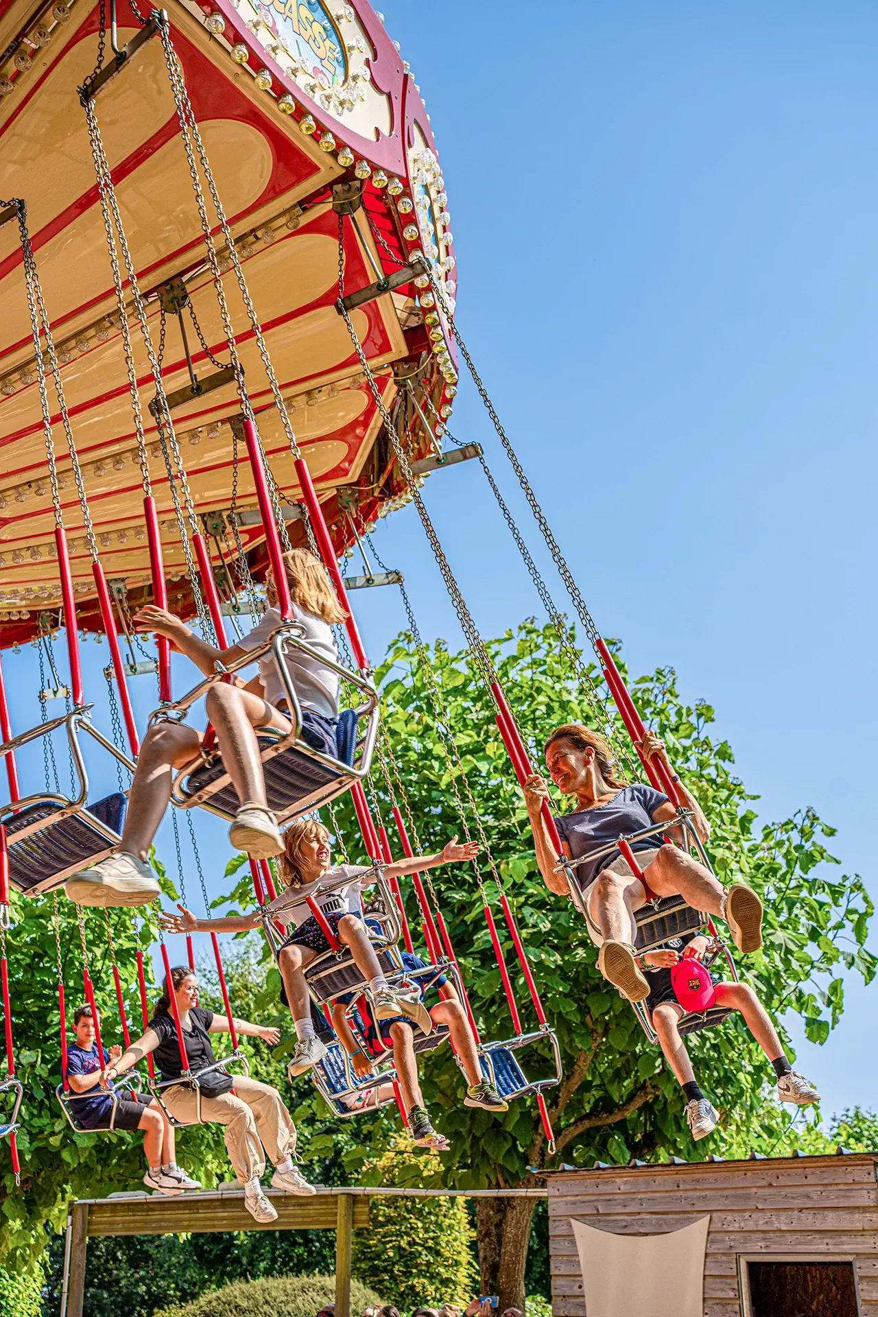 Les deux rangées de balançoires s’élèvent progressivement et vous font tournoyer dans les airs au rythme de joyeuses mélodies.