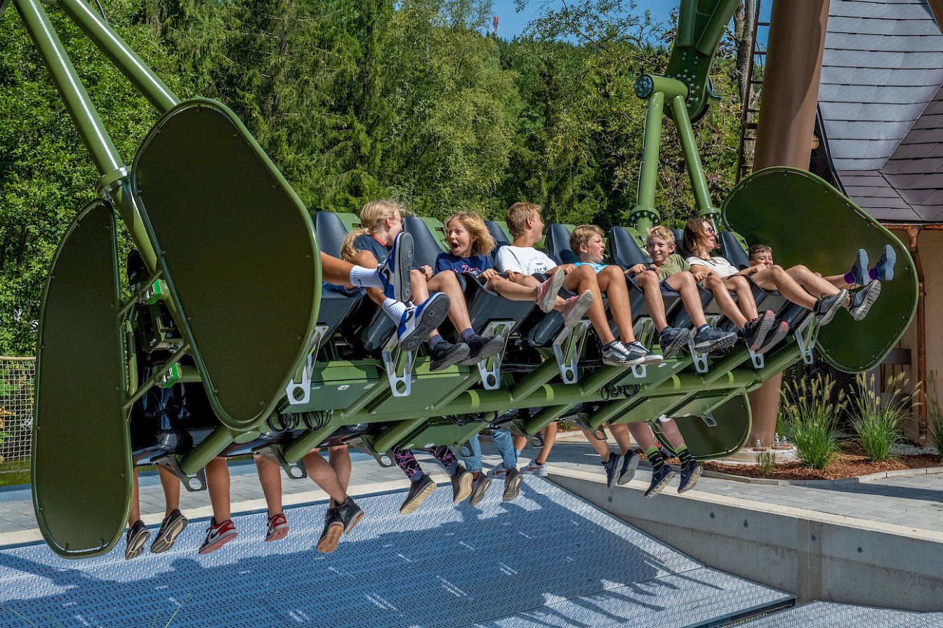 Il n’y a pas d’âge pour frissonner ! Partez à l’aventure à la recherche du projet secret d’un professeur un peu fou, dissimulé derrière des cascades et des roches mystérieuses. Dès 90 cm, les enfants vivent leurs premières sensations fortes à bord d’une impressionnante balançoire culminant à 12 mètres de hauteur. Fous rires garantis en se balançant d’avant en arrière au-dessus d’un plan d’eau, dans un décor spectaculaire où la nature rencontre une ambiance industrielle steampunk.